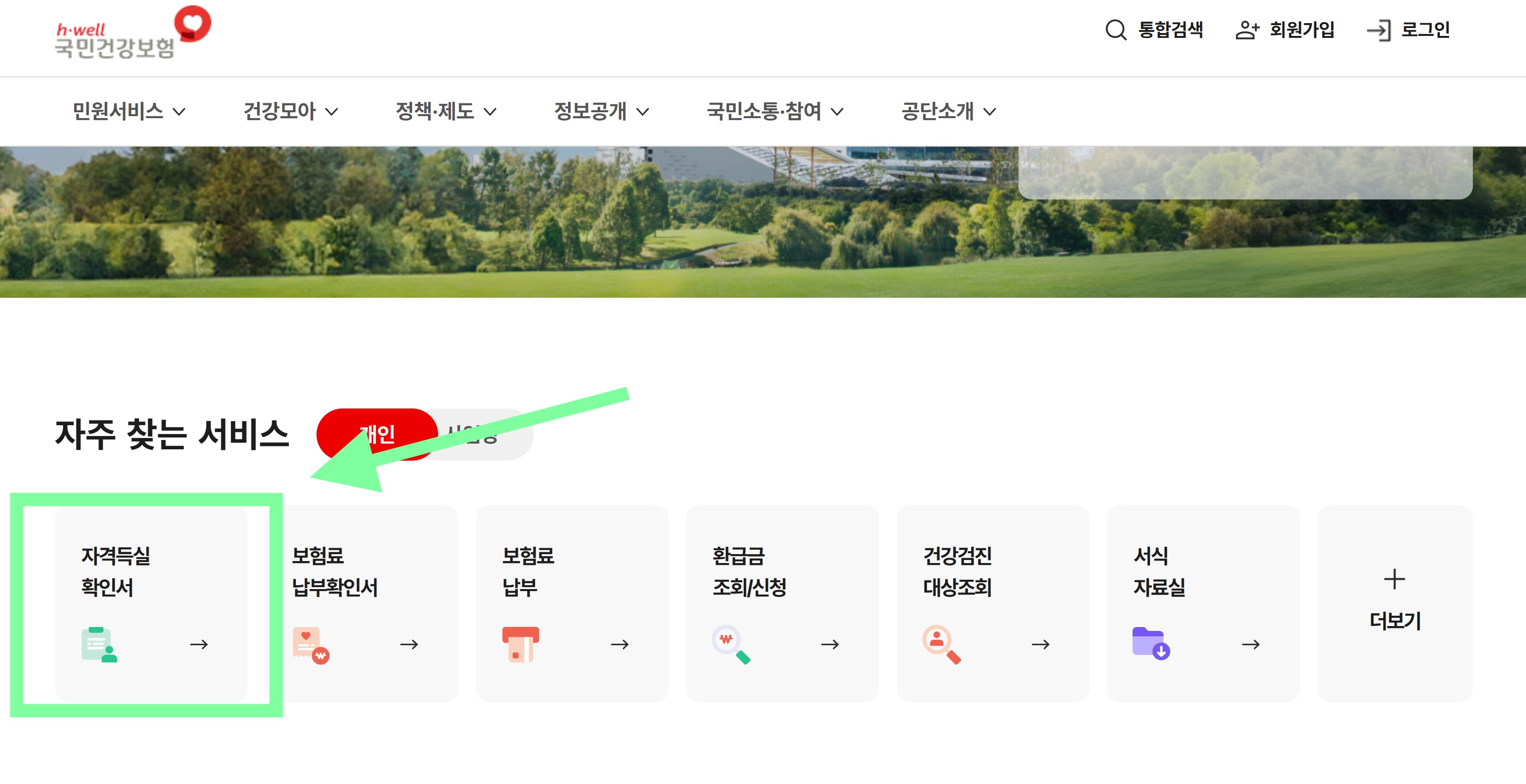 발급을 위해서는 국민건강보험공단 공식 사이트에 접속해야 합니다. 홈페이지 초기 화면에서 “자주 찾는 서비스” 항목 중 자격득실 확인서 메뉴가 바로 보입니다. 이를 클릭하면 건강보험 자격득실확인서를 신청하는 화면으로 이동합니다.